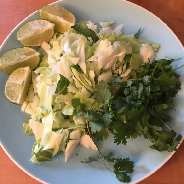 While that’s marinating, you can prepare the taco toppings. First, shred 1/2 head of cabbage and cut limes into wedges. Also set out cilantro, cheese, salsa (I used salsa verde for this recipe), and any other toppings you may want.